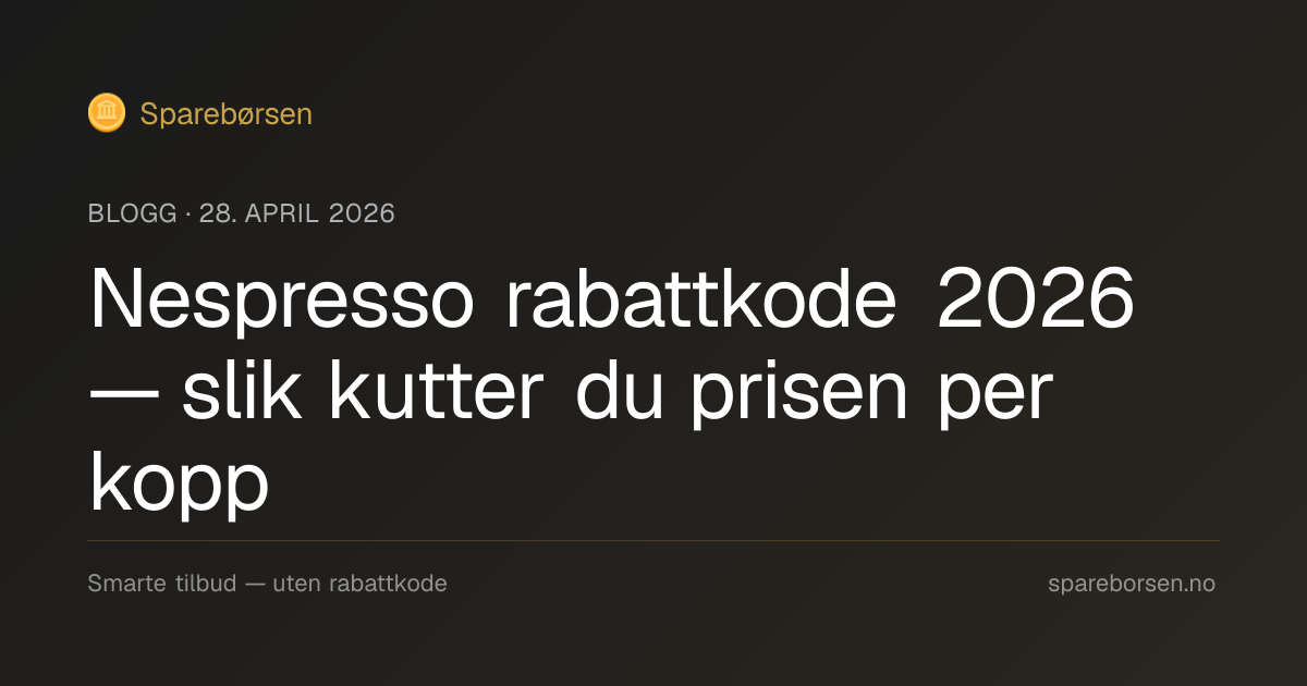 TL;DR: Det finnes få aktive «Nespresso rabattkode 2026» som fungerer for vanlige kunder. I stedet får du 8,4 % cashback via Sparebørsen — på maskiner, kapsler, melk-skumer og tilbehør. Det utgjør reell pris per kopp som er bedre enn de fleste introduksjonskoder.